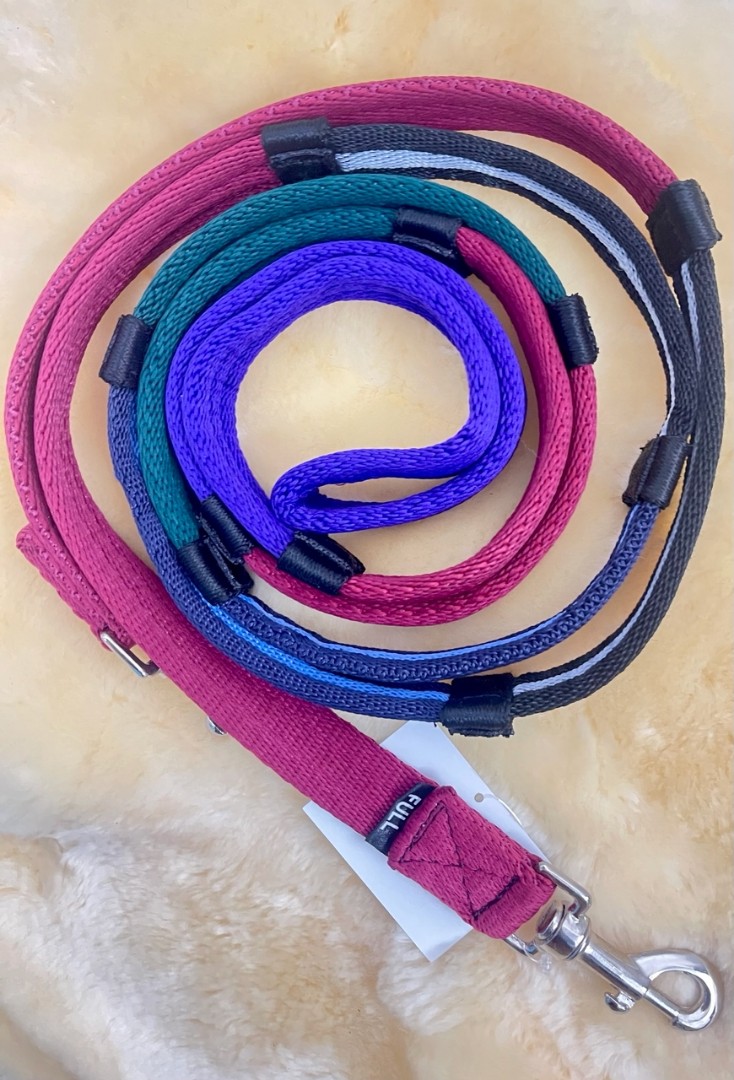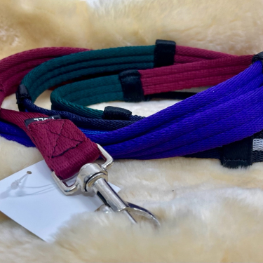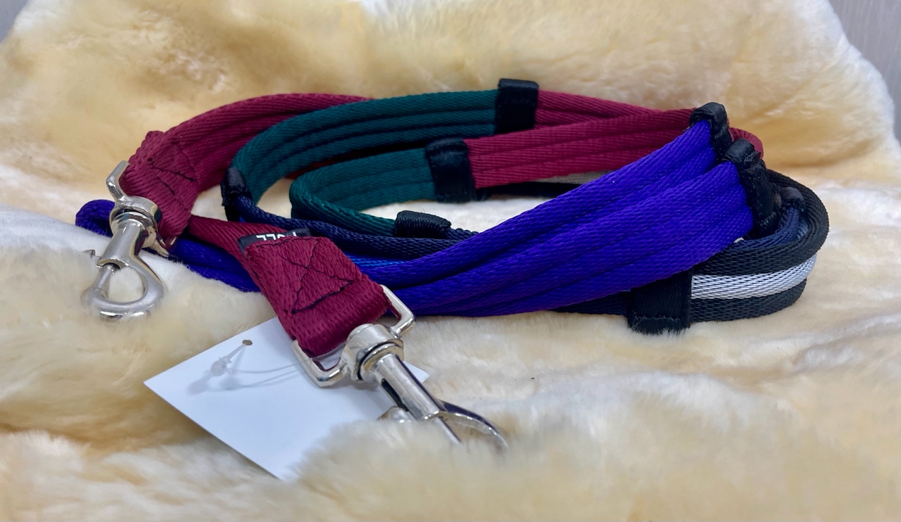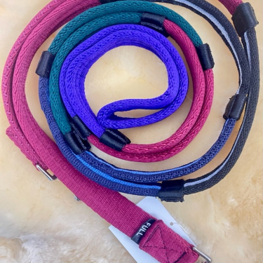 Повод тесьмяный с нашивками на карабинах. Повод цветной, разделен на 4 секции разных цветов. Такой повод используется при обучении начинающих всадников и помогает развить правильное положение рук и устойчивость.