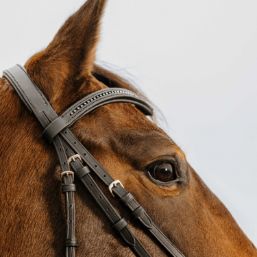 Красивое и комфортное оголовье для ежедневного использования. Оголовье изготовлено из натуральной кожи высокого качества. Затылочный, налобный ремень и капсюль имеют подложку из мягкой натуральной кожи. Хорошо смотрятся налобный ремень V-образной формы и выпуклый капсюль. Налобник украшен стразами. Фурнитура из нержавеющей стали, нащёчные ремни на пряжках. Фурнитура серебристого цвета. Поводья в комплект не входят.