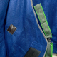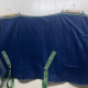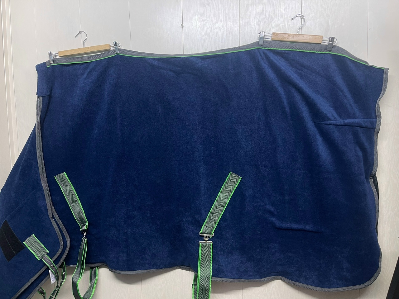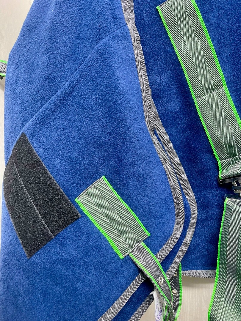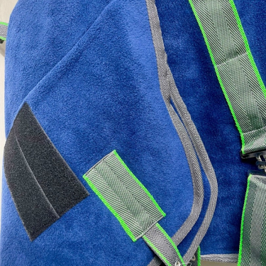 Попона с запахом на груди из плотного, высококачественного флиса. Флис хорошо впитывает и отводит влагу, хорошо сохраняет тепло и не требует особого ухода. Попона хорошо "садится по фигуре", имеет три регулируемые застежки на груди, что позволяет регулировать размер и два подбрюшных ремня. Все края обработаны плотной тесьмой. Материал насыщенного синего цвета.