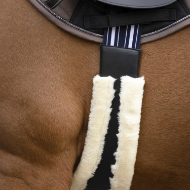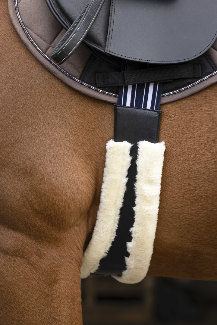 Подпруга из искусственной кожи с подкладкой из плотной синтетической овчины анатомической формы. С удобными роликовыми пряжками из нержавеющей стали на двойных эластичных резинках с обеих сторон. Подпруга с центральным кольцом для крепления вспомогательной амуниции.