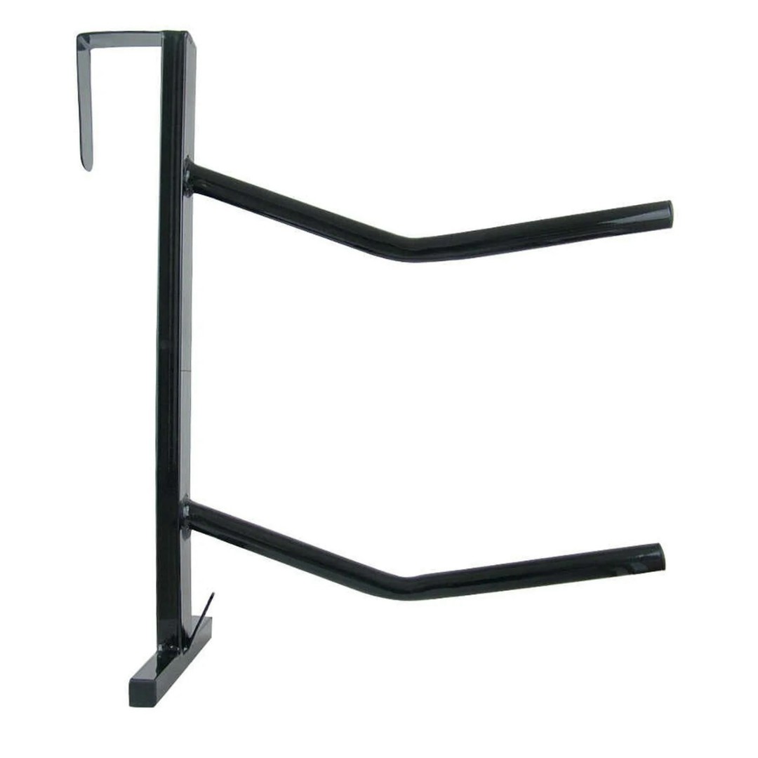 Переносной кронштейн изготовлен из металла с пластиковым покрытием. Этот прочный, легкий и небольшой по габаритам кронштейн Вы можете переносить и пользоваться им в любом месте. Кронштейн двухрядный - два держателя для седла и один крючок. Размер: высота 53 см, длина 45 см.